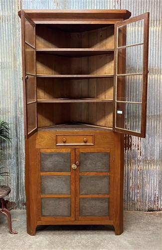 Primitive Glass Front Corner Cabinet, Display Case, Kitchen Pantry Cupboard