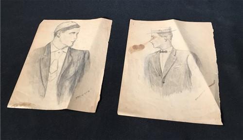 1908 Folk Art Pencil Sketches, W Hill Hand Sketched Drawing, 2 Pencil Portraits,