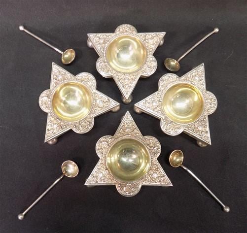 Set 4 Silver Master Salt Cellars & Spoons, Antique Single Open Salt Cellars