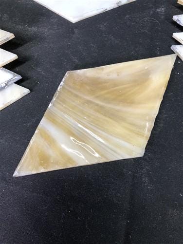 Each diamond shaped pane of stained slag glass measures approximately 4" wide, 6 1/2" tall, and 1/8" deep.