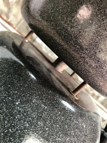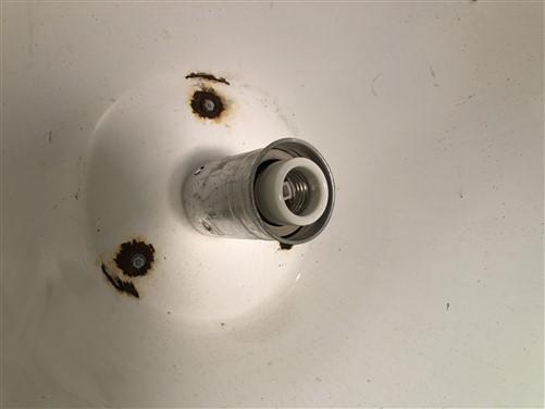 Shade is white porcelain inside and does have some nicks and flecks of rust. Exterior is a flecked gray finish.