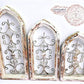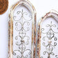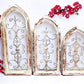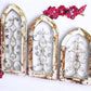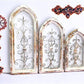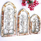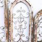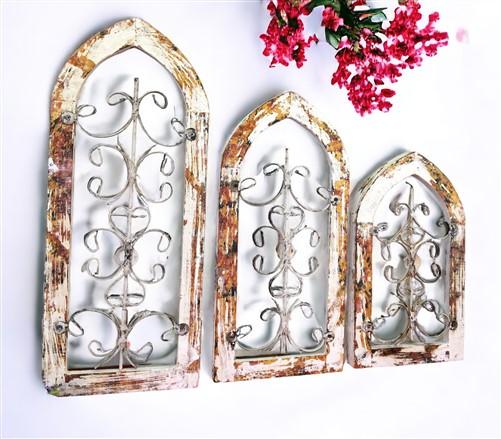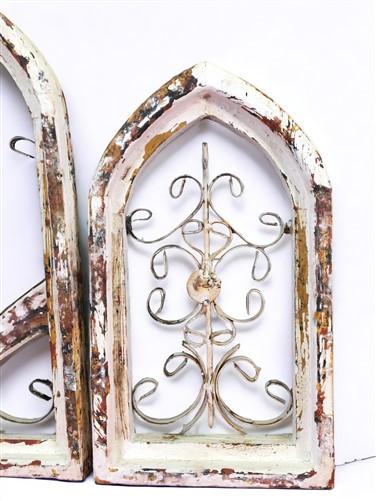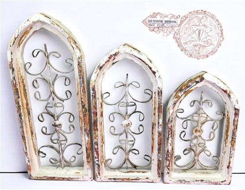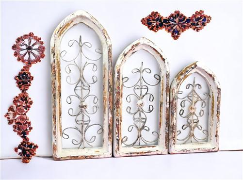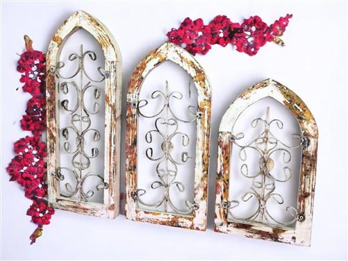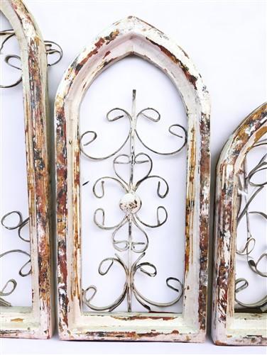 This set of 3 Wood and Metal Arched Gothic window frames are beautifully distressed. We do have several sets of these so the one you receive could be slightly different in appearance than the ones in the photos. Each panel has it's own slightly unique character.