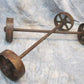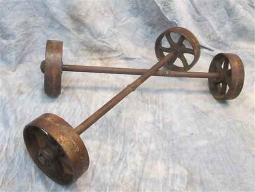Vintage iron wheels and axles with appropriate rust to prove they are the real deal.
