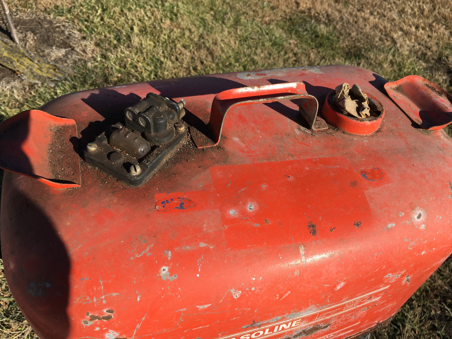 You'll get it just the way you see it in the photos, a little grime, no hoses etc. Vintage 6 gallon OMC outboard gasoline tank measures approximately 17" side to side, 11" front to back and 10" top to bottom.