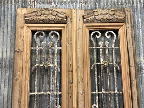 A charming pair of reclaimed antique French double doors. Each door features carved molding, unique woodwork and intricate iron scroll work. These European doors have distressed beautifully over time. The doors are rebated with overlapping door trim.
