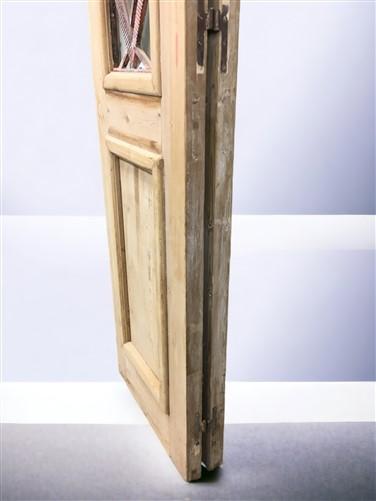These tall, solid and heavy doors are absolutely stunning with a heavenly weathered patina that simply cannot be reproduced. The only hardware that comes with these doors are what is shown in the photos. These doors are in good physical condition with various wear, scratches, nail holes, cracks, and chips typical of age and use. It is worth noting there is some minor damage, which is visible in the provided photos. There have been small repairs done to these doors. The glass is held in with brad nails and may be removed to be shipped separately. These doors are not level. Please review the photos carefully as they show the condition.