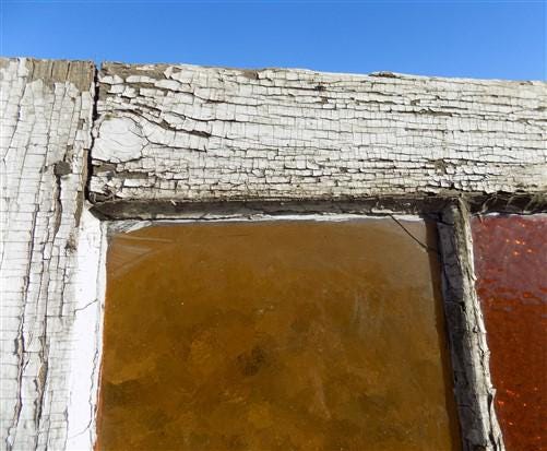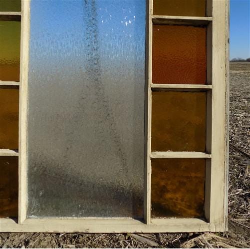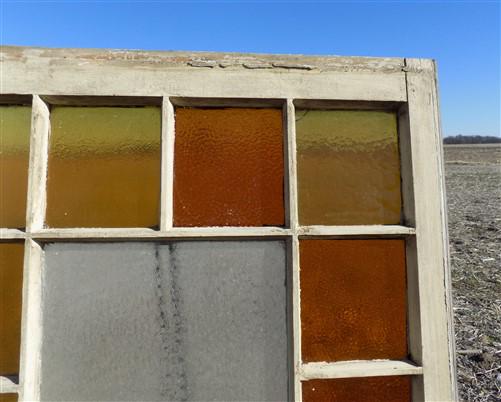 Wood-framed window features vibrantly-colored orange and yellow glass paired with clear textured Florentine glass, creating an inspiring visual display. The paint on the frame is worn and chippy, enhancing the window's antique charm. As shown in photos, two of the glass panes are cracked in the corners. Please make sure to review all the photos as they show the condition