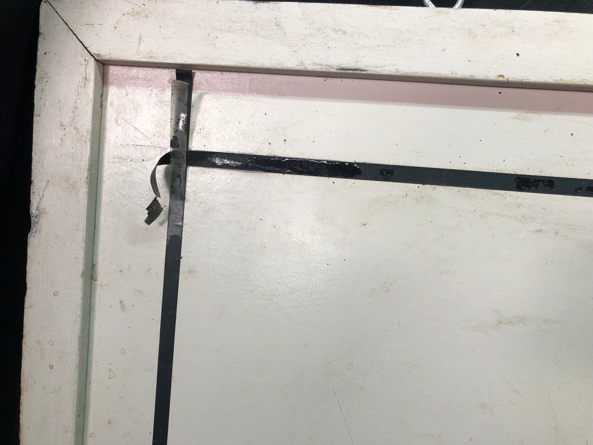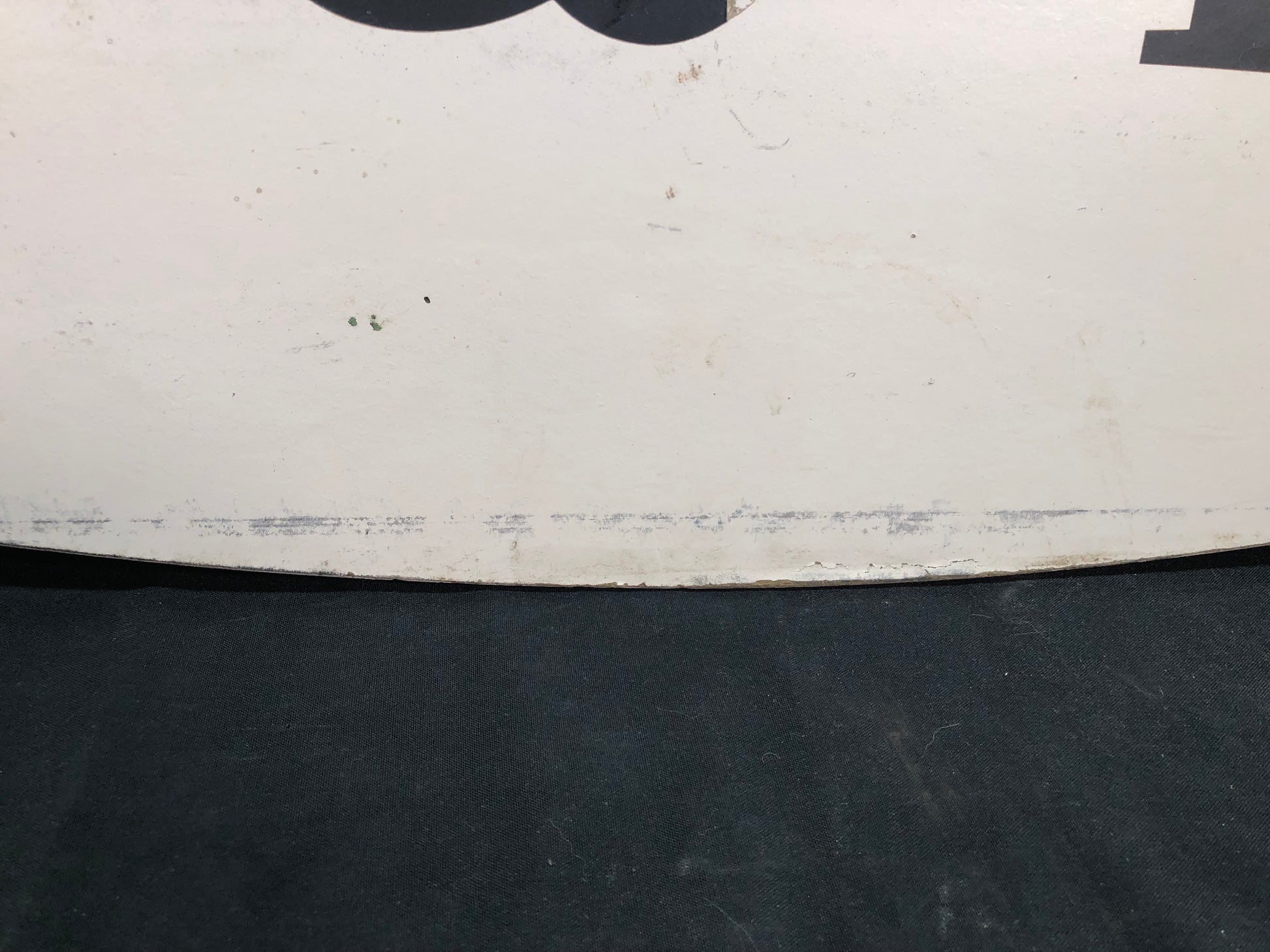 Normal signs of wear and age, some scuffs and scrapes, check out photos of both sides. Some pieces of the black lines are starting to peel up on the ends. The photos show you more of the description. 2 metal hooks on the top for hanging.