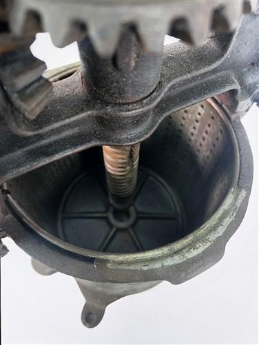 This is a complete multipurpose press with the original perforated strainer basket, strainer plate, large and small press plates, bottom ring, and stuffing nozzle. The geared crank turns smoothly and the press plate raises and lowers as it should. One plate is stuck in the bottom. Normal age wear and patina consistent with use. A solid early kitchen tool for rendering lard, pressing fruit, or stuffing sausage. Instagram: theoldgrainery You are also welcome to visit or call us Monday-Friday 9am-4pm Central Time to discuss purchases. Our number is 217-779-3992. Be prepared with the title.