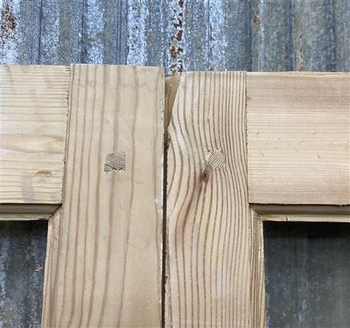 This new door has an old-world charm, with a blend of modern and traditional design. It is made of solid pine wood with clear glass. You will find some natural imperfections in the wood such as knots and very minor cracks. There are some minor stains. Please see the photos especially photos of the top and bottom of the doors.