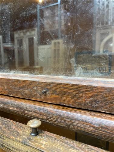 All doors open and close properly, and the bookcase shows the expected character and patina of its age. Please note in the photos, one of the doors is missing a pull.