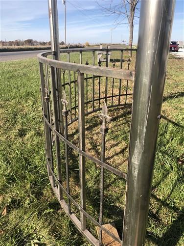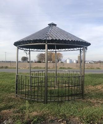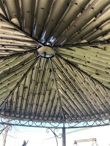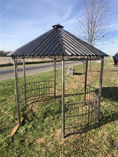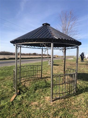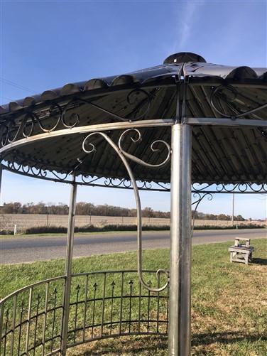 Absolutely charming garden gazebo with a simplistic designed metal roof! This gazebo with a rustic finish stands approximately 11' tall, 10'3" from side to side and 8'8" from door to door. It is 9'9" from the ground to the inside peak of the roof. The door openings are 59" across. Easy to put together and take apart, lovely garden gazebo has six poles, four half walls, six upper curved panels for the roof, and the cupola on top, with bolts included to ensure stability. Rustic styled metal pergola was designed for indoor or outdoor use. If placed outdoors, a coat of polyurethane for protection is suggested. Ideal for your backyard, garden area, arbor, or wedding venue! Please note is this freight delivery. Residential shipping is curbside, they do not bring the item inside. This item is too large for a delivery lift gate.