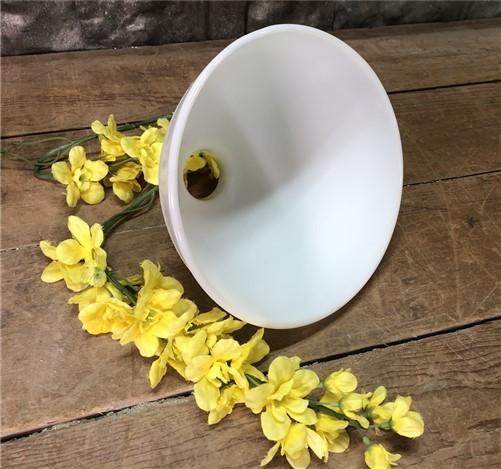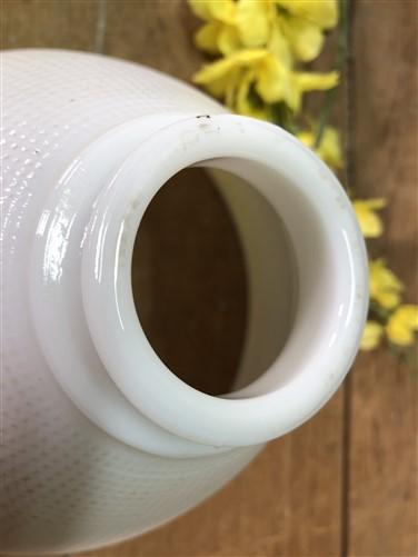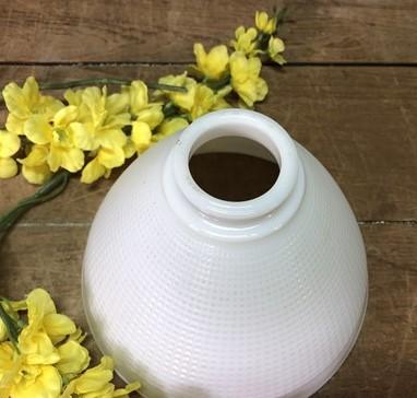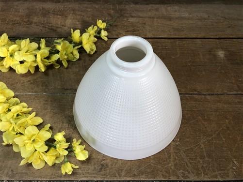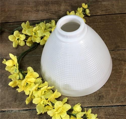 White milk glass shade in a waffle pattern. No chips or cracks found. Softly diffuses the light, nice enough to use alone or pair it under a metal or fabric shade.