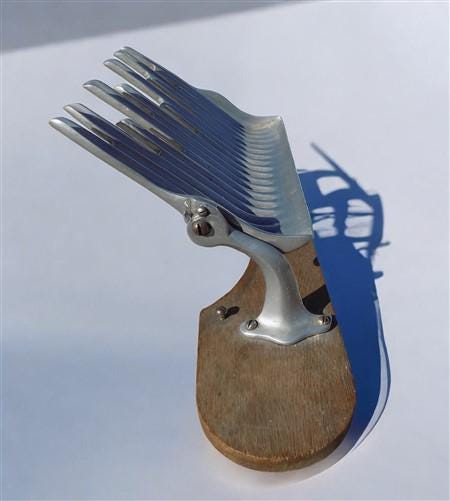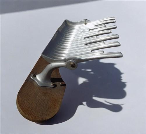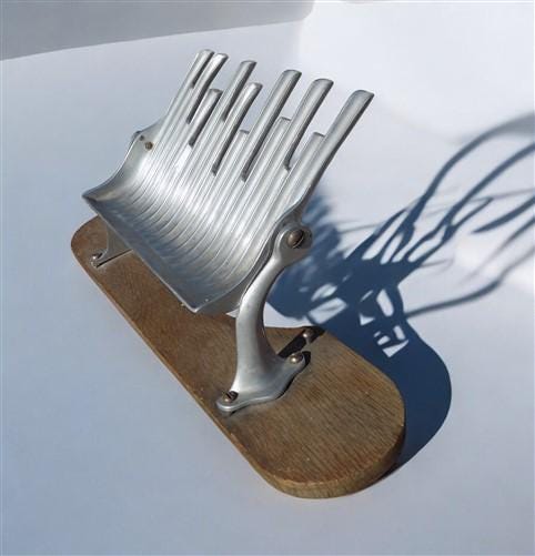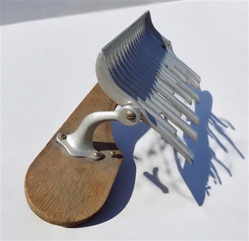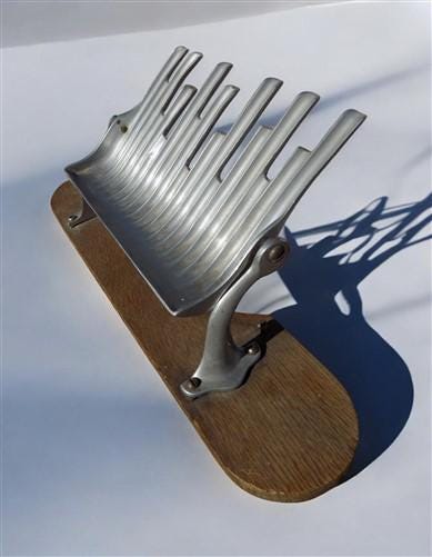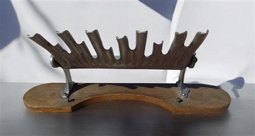 Somewhat of an unusual communion accessory you may not have seen. Made to make filling the communion cups a little easier and neater. Metal tray tips to channel the wine neatly into multiple cups at the same time. Mounted on a board base with a curved cut out for your tray. We believe that the metal section is aluminum.