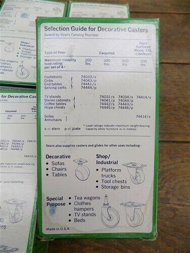 Boxes themselves show wear and tear, see photos. New old stock caster sets include the mounting hardware and are still shrink wrapped in original condition! You are getting the 4 boxes shown.