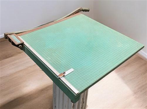 Make your life a little easier with your very own heavy duty paper cutter. Please see in the photos, a certain amount of scratches and imperfections created by previous years of use. This piece is still in great shape ready for many more years of use. The total cutting area available measures approximately 25" by 25".