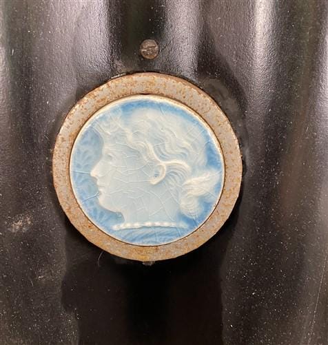 This stove features 3 burners with 2 warmer plates and a kerosene fuel tank on top. This is a very unique stove in very good shape. Please note the blue and white pendant in the center. This stove has not been tested. It has authentic age and various amounts of wear and tear approprate to its age. Use this stove as parts, or restore it to its former glory.