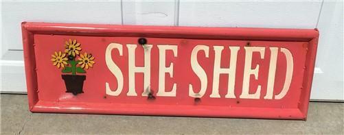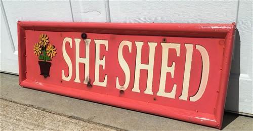 She Shed sign measures approximately 35" side to side, 1" front to back and 11 1/2" top to bottom.