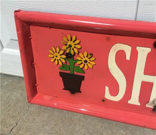 Bright pink painted metal sign with 3D flowers in a pot and She Shed logo.