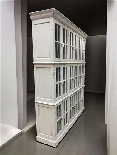This triple stack stands 7' 10" tall, 6'7 1/2" wide, and 18" deep. It features three separate stackable layers and a gorgeous distressed white paint finish. Nine sets of mullion framed glass doors display nine removable shelves inside this bookcase. Horizontal side panels and painted metal door knob pulls are the perfect finishing accents. Review photos as they are part of the description. This statuesque piece will make a fabulous bookcase, kitchen hutch, backbar, display case, or even cupboard!