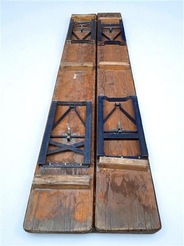 Condition: Although it may be vintage, this wood and metal table and bench set is extremely sturdy, stable, and ready for immediate use. There are some chips, stains and cracks. This table and bench set has incredible character stemming from wear, tear, and use over the years that only add to their charm!